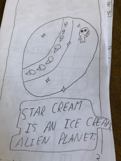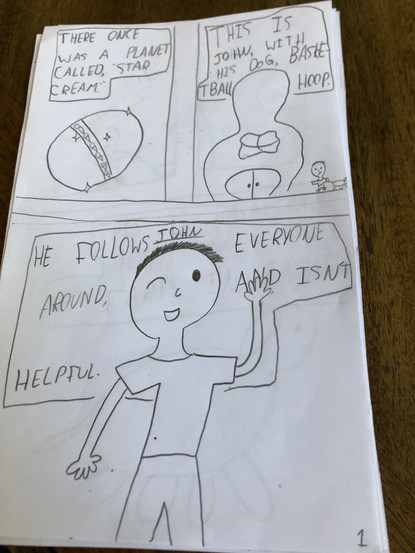 I loved when we did the comic book making. We all added setting and character ideas and had a vote about which ones we would use. For the settings, a dog won, named Basketball Hoop. A boy named John won too, he copies everyone, and follows them. He is not helpful.